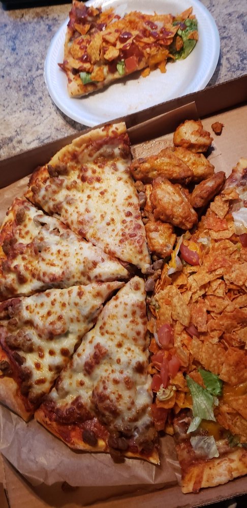 Our Taco Pizza starts with refried beans and salsa, beef or chicken, mozzarella cheese, and is finished with lettuce, tomatoes, taco chips and cheddar cheese. Order pizza for delivery or pickup